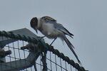 朝の校庭巡回中、餌をついばむシジュウカラ(スズメ目シジュウカラ科)とオナガ(スズメ目カラス科)と出会いました。