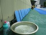 ビート板を使ったあとは、たらいに次亜塩素酸ナトリウムを入れて、1枚1枚消毒しています。