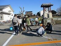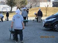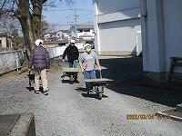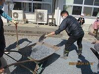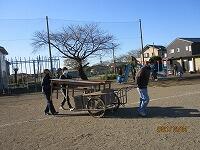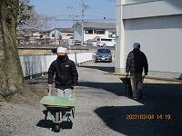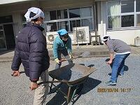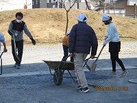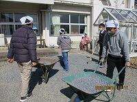 一輪車に砂利を乗せて運び、平らにしました。校長先生はじめ、