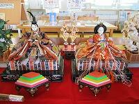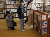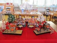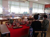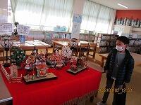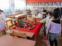 ひな人形も、人気です。今日は、1年生が、図書の返却にきていました。
