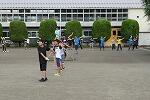 各育成会ごとに集合して整列し、あいさつの後、運動委員児童を手本として、ラジオ体操第1と第2を行いました。