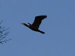 朝空を飛翔するカワウと小魚を飲み込むカワセミ