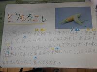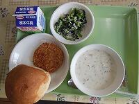 今日の給食メニューは「ハムカツサンド、小松菜ソテー、コーンポタージュ、牛乳」です。調理員さんたちが、暑い中を毎日おいしい給食を作ってくれています。今日は、給食委員会の児童がコーンポタージュの材料でもある、とうもろこしとタマネギの紹介をしました。