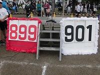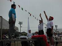 進行係の号令のもとプラカードを持つ紅白組の代表者たち