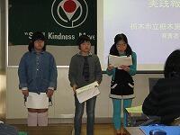 去る1月24日(土)に「栃木市小さな親切実践発表会」が栃木東中において行われました。本校は6年生の中島吏瞳君、生井葵さん、5年生の北島玲さんの3人で普段の活動の様子を発表しました。