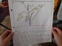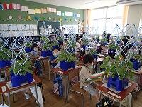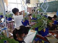 あさがおのつるが長くなって、支柱の一番高いところまで達したものも増えてきました。つるの様子を観察して、追肥をしました。