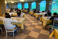 お昼は、鶴ヶ城会館でワッパ飯です。感染症対策のため、同じ方向を向いて、黙って食べています。前後の間隔は2メートル以上開いています。