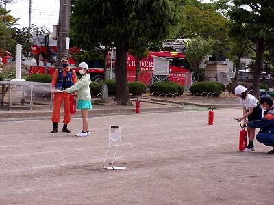 校長先生も訓練し、消火器で火が消えないときはどうしたらよいか、確認しました。