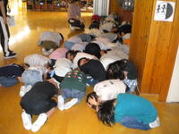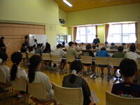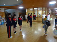 次に、調理室からの火災発生の放送を聴くと、落ち着いて体育館に避難することができました。校長先生や担当の先生から、しっかり判断して行動できたことをほめられました。これまでの訓練で身に付けた防災対応能力を発揮することができました。