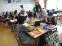 4年生は、体育の跳び箱運動でした。開脚飛びと台上前転の技を磨き合おうと、お互いの目標を知り、タブレット端末で動きを撮影してアドバイスし合いました。