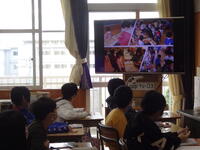 まず、自分たちの思い出の写真を見て、6年間を振り返りながら英語での表現を学びました。