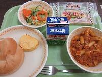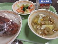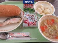 今日の給食は「アップルパン・牛乳・鮭のマヨネーズ焼き・こふきいも・アルファベットスープ」で、あらかじめ一人ずつ希望
