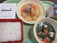 昨日の給食は ごはん、牛乳、厚焼き玉子、肉じゃが、フレフレふりかけでした。この献立には運動会をがんばってほしいという願いが込めました。