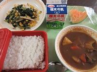 カレー・小松菜とコーンのソテー・カットフルーツ