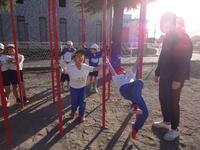 3年生の学年体育では、校庭と体育館に分かれて運動に取り組んでいます。校庭では、鉄棒運動です。ワークシートにある様々な技を目標にして何回も挑戦しています。のぼり棒でも逆上がりの体の動きを練習しました。