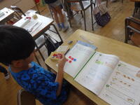最初に「ドーナッツが6個のとき、3人で同じ数ずつ分けたときの一人分」を求めました。既習の内容を思い出しながら、6÷3=2という式を求め、言葉の式やおはじきを使って説明できました。