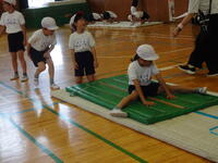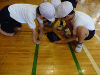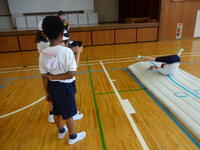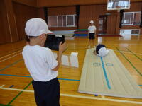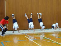 マット運動の系統性をもとに、様々なコースを用意して練習に取り組みました。子どもたちは、自分のめあてとする技ができるようにと、手のつき方や脚の伸ばし方などを意識していました。