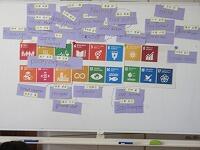 SDGsホワイトボードキラキラに貼っていきました。こんなに関わりがありそうです。