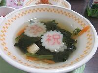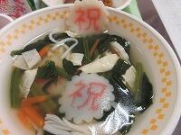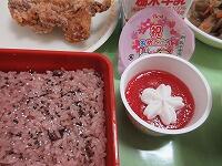 』で、「お赤飯・ごま塩・牛乳・鶏のからあげ・きんぴら・すまし汁・お祝いいちごゼリー」のメニューでした。すまし汁の中には「