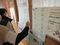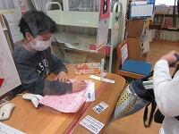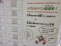 図書室廊下の妖怪パン投票用紙にシールを貼ります。「どの『ようかいパン