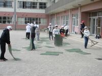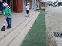今日の昼休み晴れ、グリーンマットキラキラがさらに使いやすく・砂をとる効果が上上がるようにと、6年生のボランティア有志星のみなさんが、マットの砂取りと、地ならしをしてくれました。