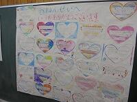 6年生星の教室を尋ねたら、1年生笑うからのメッセージ鉛筆が届いていました。模造紙いっぱいに、習ったばかりのひらがなで、一生懸命に書いて鉛筆くれた一人一人のコメントハートがまとめられていました。「だいすきにっこり 6ねんせいキラキラ」や「いつもありがとうございますにっこり」の表題がついています。