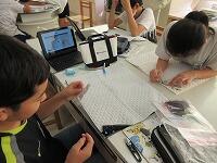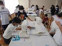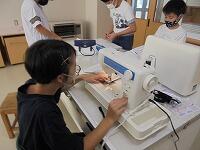 「ベンリー定規にっこり」や「角とりくん了解」と言った秘密兵器!を使って、ナップサックのひもを通す部分4カ所を、三角に折って「まち針キラキラ」で留め、しつけ縫いピースをしました。みなさん真剣、集中して花丸取り組んでいます。
