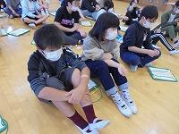 みんな真剣了解に、自分の心臓の鼓動ハートを数えています。です。「86回でした。」「ぼくは83回。」「運動急ぎの後って、どきどきハートするよね。」