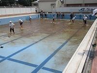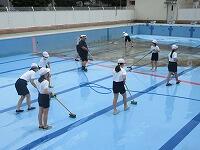朝、降っていた雨雨も、午後には気持ちのよい青空晴れが広がりました。6時間目、6年生のみなさんがプール汗・焦るに集合し、プール清掃急ぎ最後の仕上げキラキラを行いました。