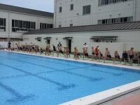 プールサイドキラキラでも熱中症対策!。水筒を持参して、水分汗・焦るを取りながら授業を行っています。