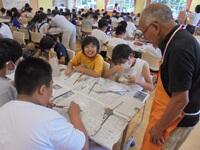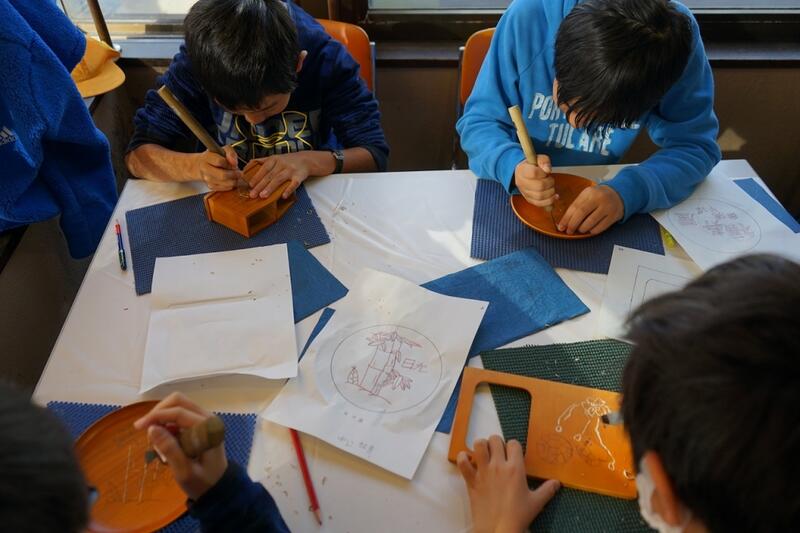 午後は日光彫り体験です。職人さんのお手本を見る子どもたちは、技術の高さに驚き、目を輝かせていました。その後の作業にも集中して取り組んでいました。