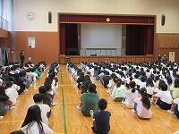 体育館へは、2階渡り廊下と1階通路から、学年それぞれ避難急ぎしました。安全確認了解後、すばやく人数の報告鉛筆です。避難するときの約束星を守って、しゃべらずに花丸落ち着いてOK避難ができました。