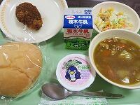 は「丸型コッペパン・牛乳・モロのフライ・コールスローサラダ・大豆入りカレースープ・県民の日ゼリー
