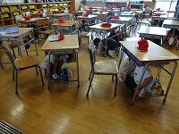 まず、地震発生の放送を聴くと、子どもたちはすぐに机の下で安全確保の姿勢をとれました。各学年から職員室に安全確認の連絡を入れることも訓練しました。