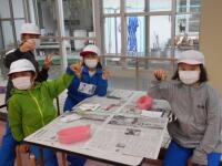 して組み合わせて楽しい形を作っています。工作用紙を織り込んで箱の形に糊付けしたところは、くっつくまで洗濯ばさみ