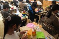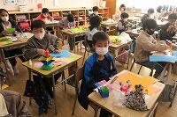 楽しんで』の学習で、色とりどりの工作用紙を箱の形
