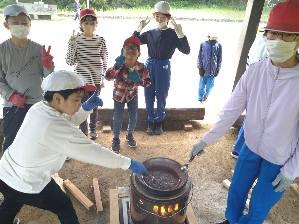 がんばれ~。続けて『砂の造形』では、各班協力して、海をイメージさせるアート