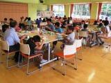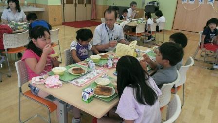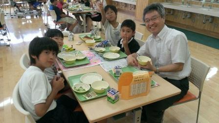 ランチルームで7月生まれの児童・教職員と栃木市教育委員会の4名の先生方といっしょに