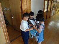 1年生にとっては「学校たんけん」ですが、2年生にとっては「学校あんない」です。グループごとに2年生が校内を案内してくれました。図書室や音楽室、理科室などを教えてくれました。授業をしている教室の前では静かに行動し、時間を守って活動できました。