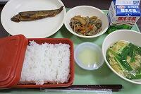 の甘露煮・五目きんぴら・かんぴょうとにらの卵とじ汁・ミニレモンゼリー」で、栃木県の川で取れた鮎