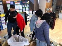 環境美化委員会の児童が、今日もたくさんのアルミ缶を潰しています。