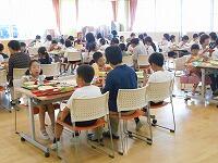 今日は、5月のバースデーランチでした。5月生まれの友達や先生方が日惜ホールに集まって、みんなで給食を食べました。その中に、「食のマナーボランティア」として、地域の皆様にもご一緒していただきました。