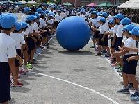 なかよし班で力を合わせての、大玉転がしの練習です。