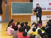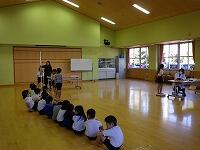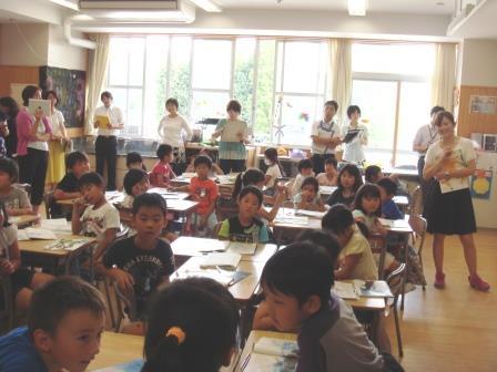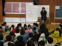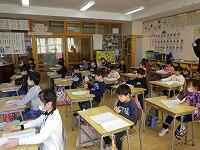 その間子どもたちは、1年生の教室で「一日入学!」。楽しく歌を歌ったり、お話・紙芝居を聴いたり、お絵かきをしたりしました。