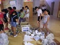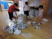 環境美化委員会の児童が、受け取ったアルミ缶を段ボールの上でつぶして、大きな袋にまとめてくれています。たくさん集まりました。