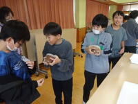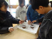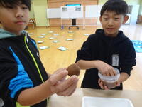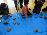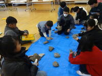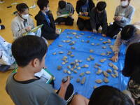 次に、上流と中流の川原の石を観察しました。教職員が現地で集めてきた話も聴いて関心が高まっていました。大きさだけでなく形や重さなどの違いがあることがわかりました。