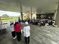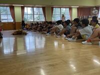 5年生の臨海自然教室も2日目です。天気にも恵まれ、朝から元気いっぱいです。朝食の後、部屋の片づけ・清掃をしました。シーツを畳むなど慣れないことでも協力してがんばりました。
