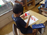 今日は、遊園地のアトラクションの絵を見て、乗っている人の数を数える方法を考えました。子どもたちはいくつのまとまりがあるか見当をつけたり、おはじきを使ってまとまりを数えたりしました。
