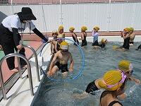 最後にみんなで、流れるプールキラキラにしてみましょう。大きな流れ汗・焦るができましたねピース。流れに乗って、先生の持っているフラフープ了解をくぐってみましょう。みなさんがんばりました。「たのしかった~笑う。」