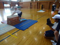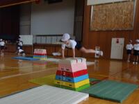4年生は、体育で跳び箱運動を学習しています。今日は、高さの異なるコースを使って開脚跳びを練習しました。